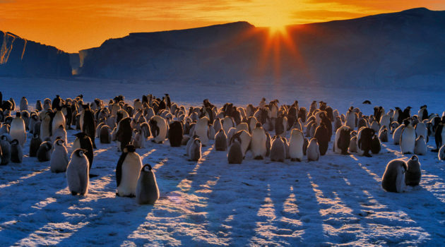 Kaiserpinguine auf dem Weg von der Brutkolonie über das Packeis zum offenen Meer, Foto: Canon EOS 1N und EF 16-35 mm F2.8L IS USM, 1/1.000 Sekunde, F5.6, Fuji Velvia, ISO 50