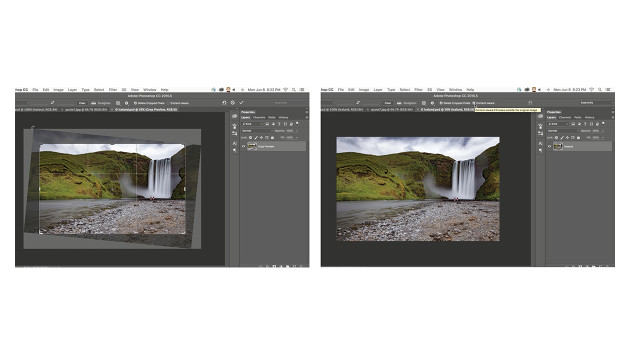 * Content-Aware Crop in Photoshop, womit die Lücken, die beim Drehen und Vergrößern von Bildern über die Originalmaße hinweg entstehen, automatisch aufgefüllt werden.