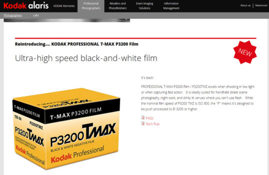 Wie die das Nachfolgeunternehmen des legendären Filmherstellers Kodak Alaris bekannt gab, soll schon im März der Professional T-MAX P3200 Film / P3200TMZ neu aufgelegt werden. Angesichts eines attraktiven Marktes für analoge Produkte hat Kodak Alaris bereits einige legendäre Farbnegativfilme wie die legendäre Portra Reihe im Programm und auch angekündigt, den einst so erfolgreichen Ektachrome 100 wiederzubeleben. Der unter den Kodak SW-Filmen empfindlichste T-MAX P3200 verfügt nicht wie zu erwarten über eine Grundempfindlichkeit von ISO 3200. Er erreicht diese nur über eine Push-Entwicklung. Die Grund Empfindlichkeit liegt bei ISO 800. Das ist angesichts der Empfindlichkeit von Sensoren, wie sie aktuell in digitalen Kameras zum Einsatz kommen, geradezu rührend wenig. Wie Kodak selbst mitteilt steht das P im Namen des neuen, alten Schwarzweißfilms für Push-Entwicklung die bis zum ISO 3200 und höher erfolgen kann. Jedoch warnt Kodak Anwender auch und empfiehlt ihnen, erst zu testen, ob die Ergebnisse bei Push-Entwicklungen auf höhere Empfindlichkeiten auch ihren Anforderungen genügen.