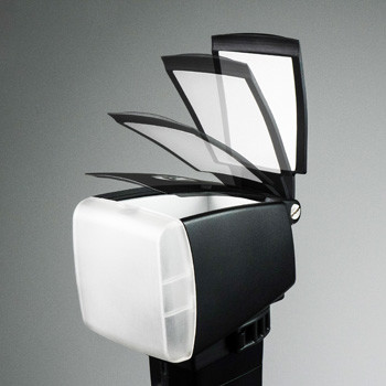 Der BounceLite Multifunktions-Lichtformer für Aufsteckblitze vereint Softbox, Bounce-Reflektor und Filterhalter in einem.