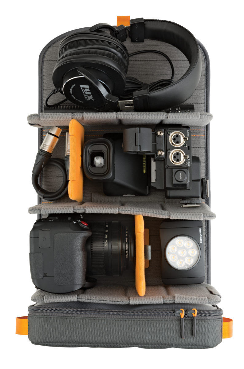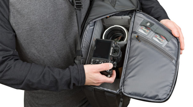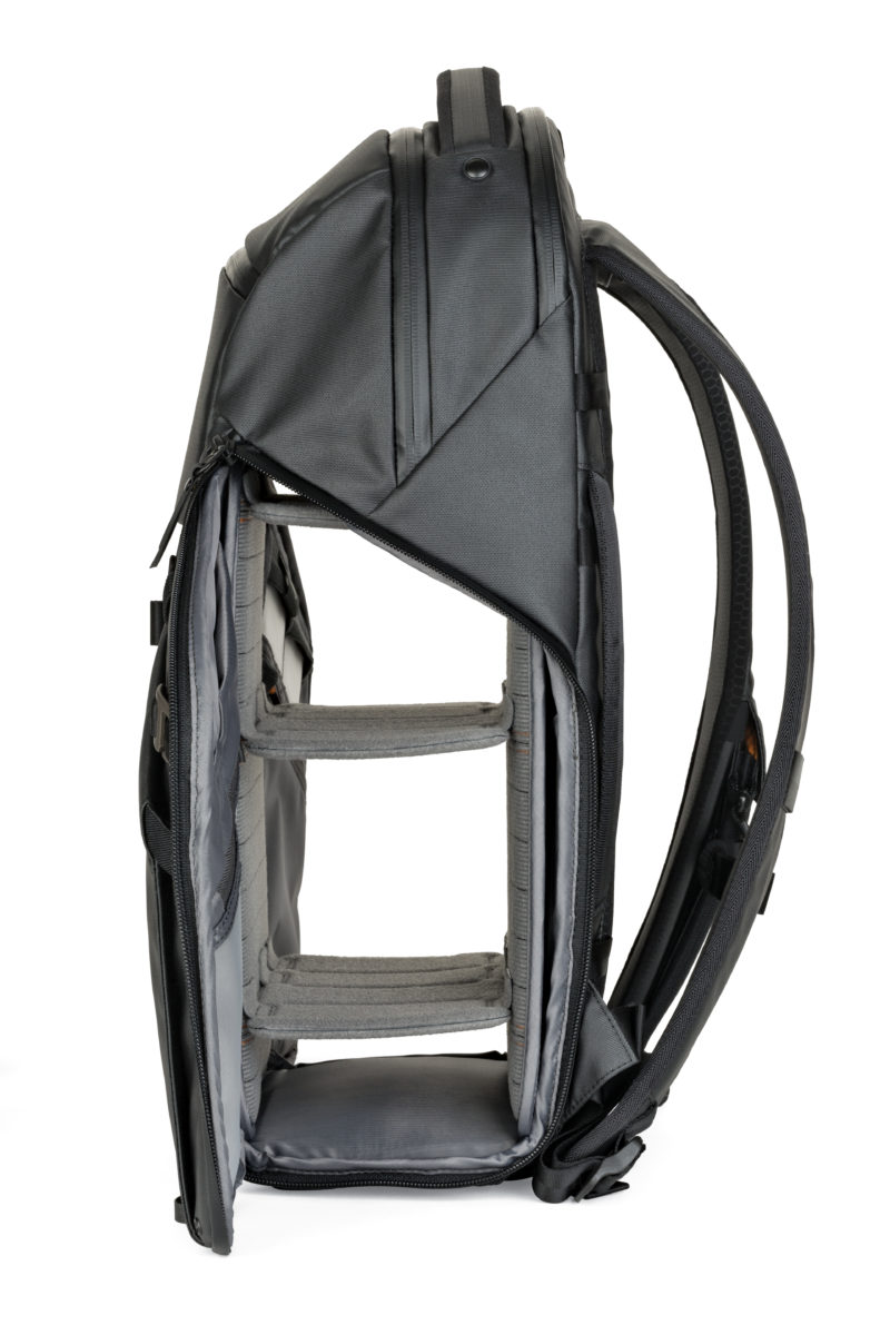 Das innovative QuickShelf Innenteiler-System des Rucksacks lässt sich entweder in Form von drei Fächern auseinander- oder flach zusammenklappen. Duale seitliche Zugangspaneele sorgen für einen schnellen Zugriff auf die Ausrüstung. Die Laptop-Aufbewahrung CradleFit schützt einen 15-Zoll-Laptop.