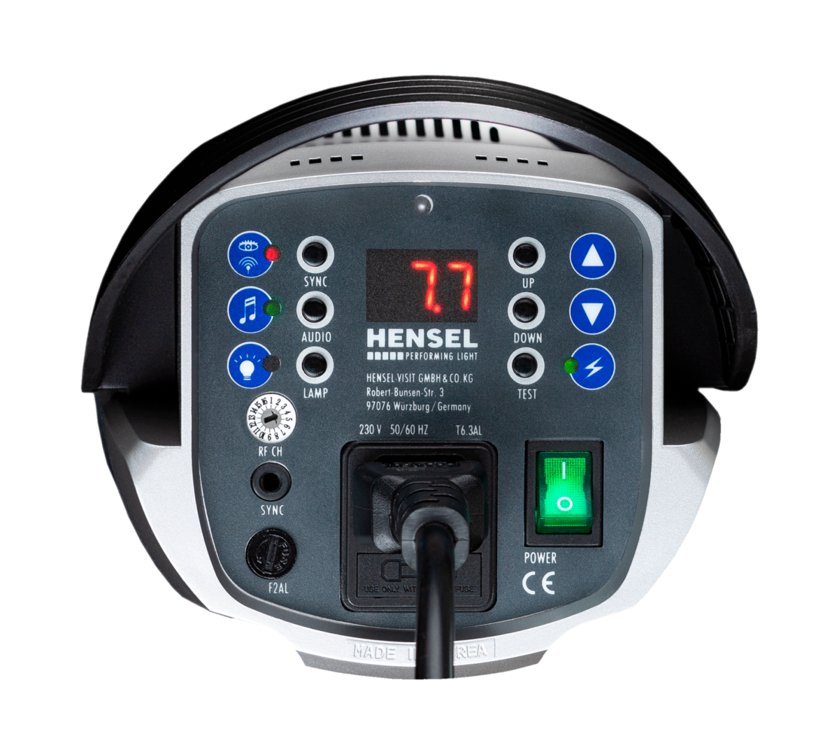 Eine aktive Kühlung gewährleistet den sicheren Dauerbetrieb und erlaubt die Verwendung einer hellen 150W Halogenlampe (GX 6.35) als Einstelllicht. Die Leistungsanzeige kann von relativen Blendenstufen auf Wattsekunden umgeschaltet werden.