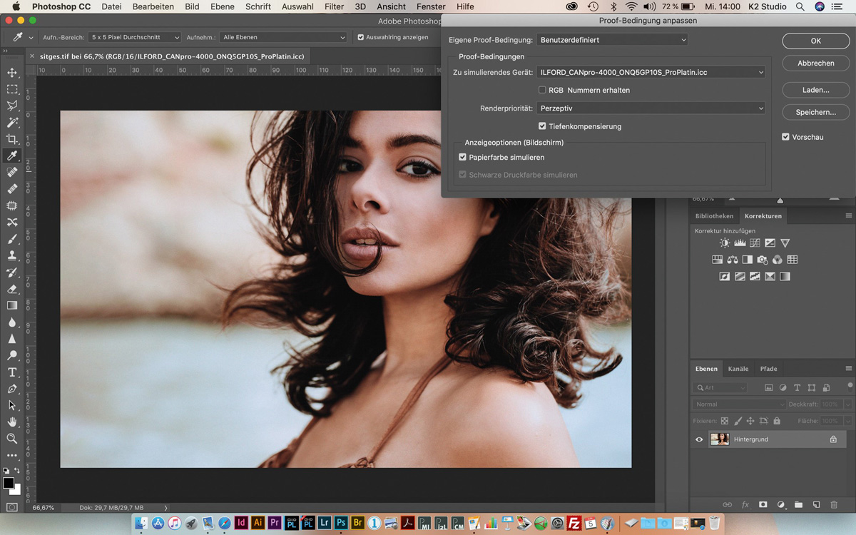 Wichtig ist aber, dass die Betrachtung des Druckergebnisses unter Tageslicht geschieht, die Bildbearbeitung und Kontrolle an einem kalibrierten Monitor durchgeführt wird und man ein passendes ICC-Profil