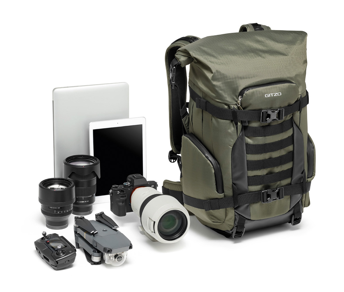 Der Gitzo Adventury 30l Rucksack fasst eine professionelle DSLR mit angesetztem 70-200 mm f/4 Tele-Zoom sowie entweder eine zweite Kamera und bis zu vier Objektive oder ein 400 mm f/4 Super-Tele-Objektiv, weitere Objektive und Zubehör. Die Inneneinteilung lässt sich auch hier flexibel anpassen, sodass alternativ eine umfangreiche, hochwertige DSLM-Ausrüstung (z. B. Sony Alpha 7 oder Alpha 9) und eine kompakte Drohne (z. B. DJI Mavic Pro) inklusive Zubehör Platz finden.