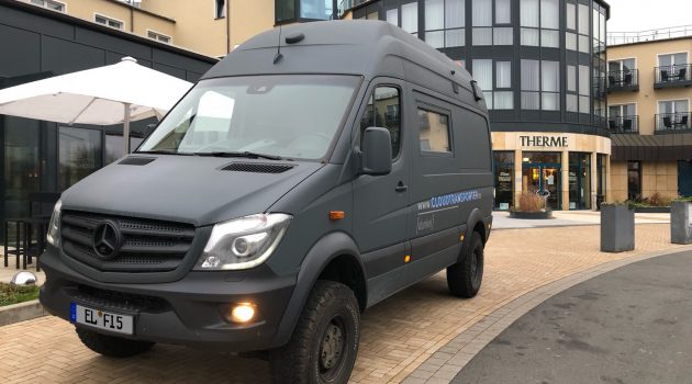 Der anthrazitfarbene Cloudtransporter gehört der Gattung der Mercedes Sprinter an. Höhergelegt, mit Permanent-Allrad, drei Differenzialsperren und vergrößerten Reifen steuert er über unwegsames Gelände. Einige Innovationen kommen seiner speziellen Nutzung entgegen: der hypermobile Innentisch für flexibles Arbeiten, eine Speziallackierung oder Stromreserven, die manches Expeditionsmobil in den Schatten stellen. Das zur Dämmung verwendete „Spaceloft“ gilt als das Material mit dem höchsterreichbaren Wärmedurchlasswiderstand.