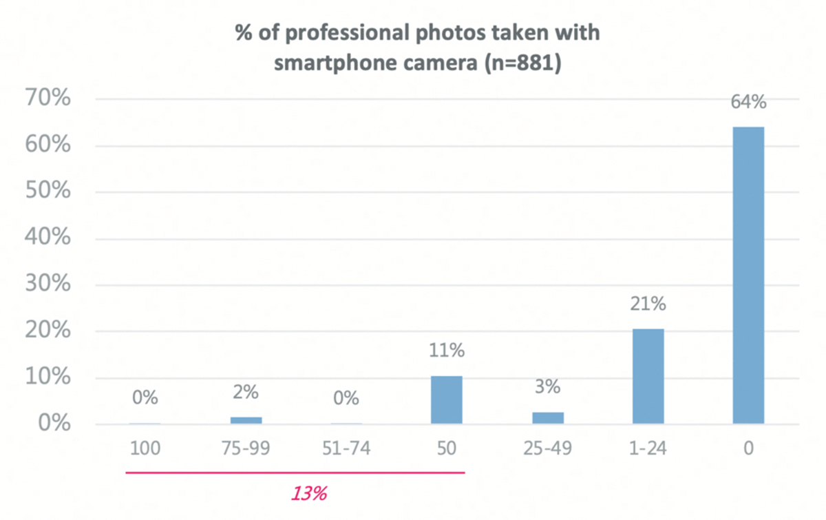 Profoto hat eine Studie zum Einsatz von Smartphones in der professionellen Fotografie in Auftrag gegeben. Demnach machen aktuell 13 % der befragten Profi-Fotografen die Hälfte oder mehr ihrer professionellen Fotos mit einem Smartphone, während 64 % dieses nur für ihre nicht-professionellen Fotos nutzen.