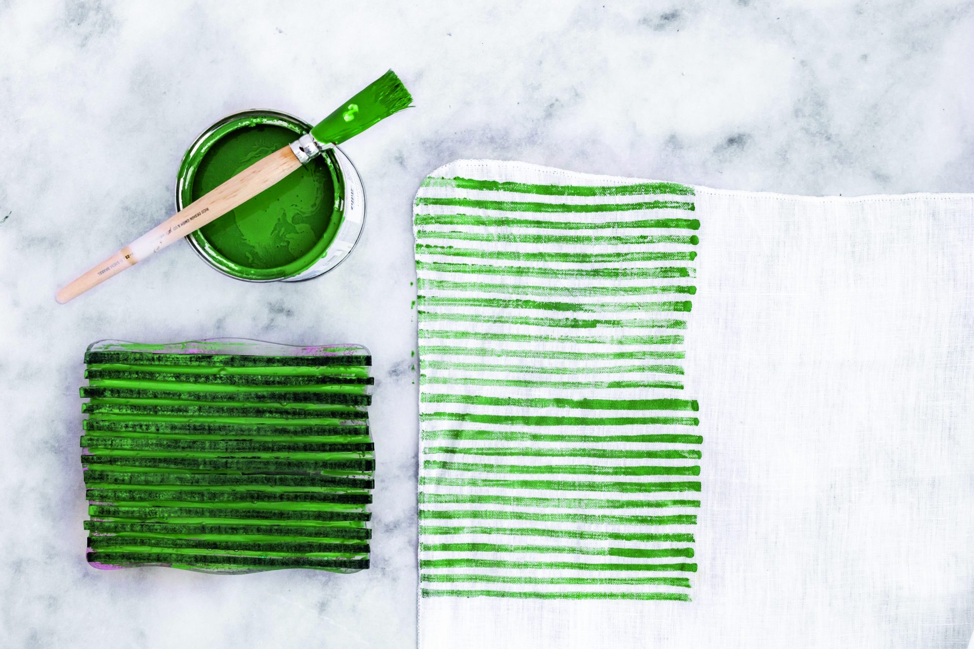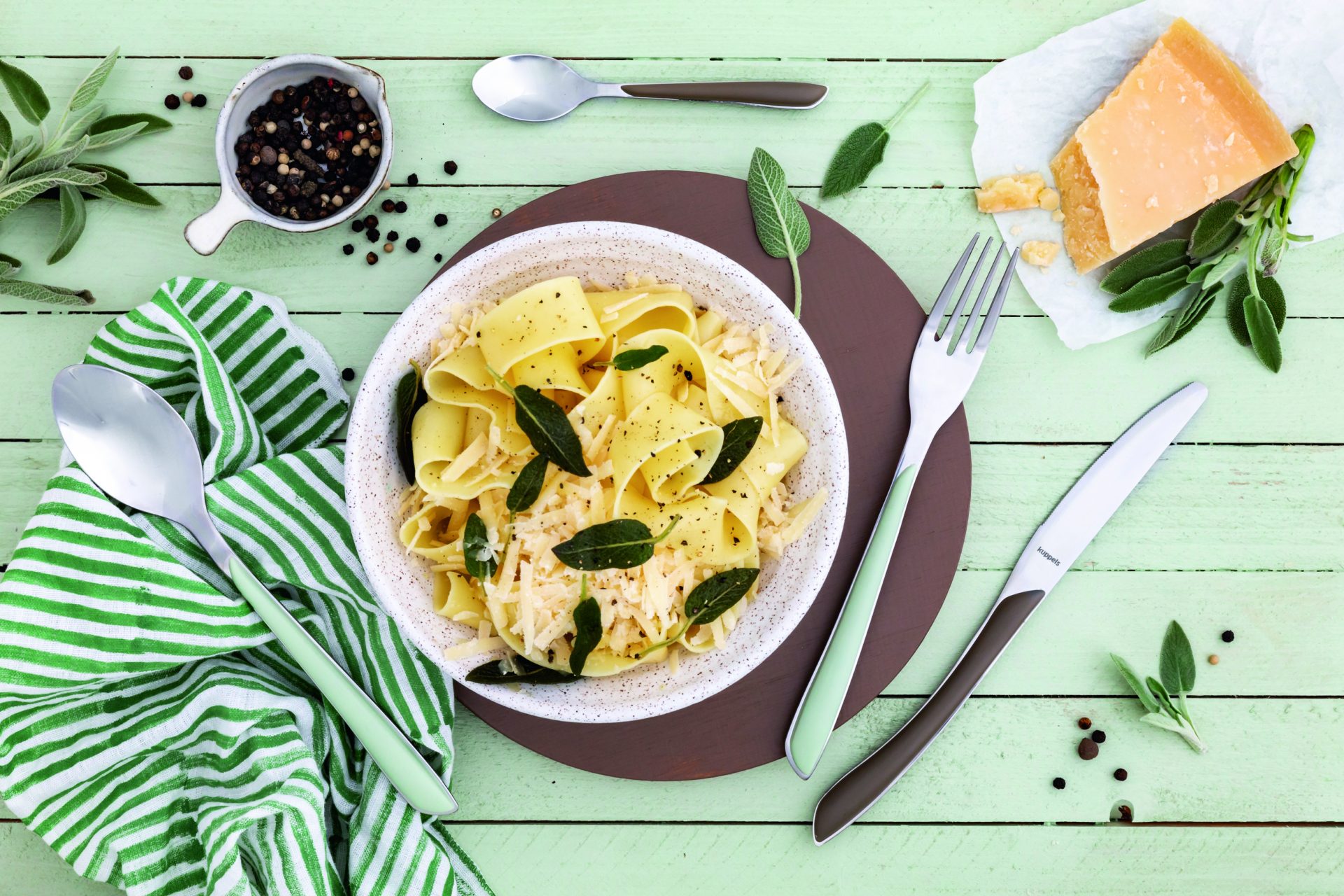 Die zum Datacolor ColorReader gehörende App hat der Fotografin zum Beispiel passend zum Salbeigrün des Bestecks ein dunkleres Grün vorgeschlagen, dass sich harmonisch einfügt. „Damit habe ich ein weißes Geschirrtuch bestempelt und dem Set so den finalen Touch gegeben“, so Vera Wohlleben.