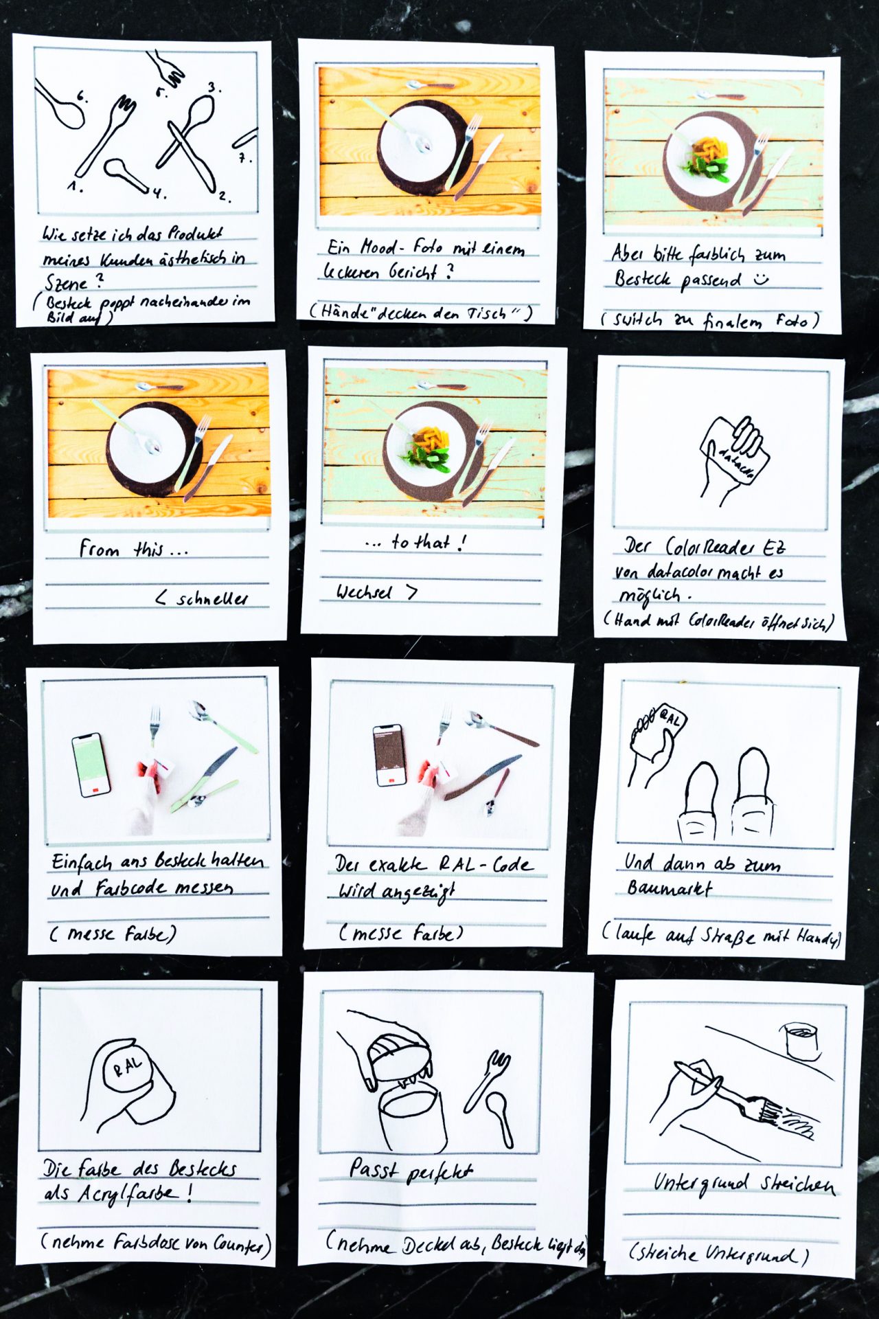 „Mit diesen Infos bin ich dann zum Baumarkt gegangen und habe dort die exakten Farbtöne anmischen lassen“, so die Fotografin, denn dank des ColorReaders kann man die Farbtöne von beliebigen Objekten exakt in eine Acrylfarbe „übersetzen“. Damit hat sie dann den Foto-Untergrund und das kleine Holztablett gestrichen.