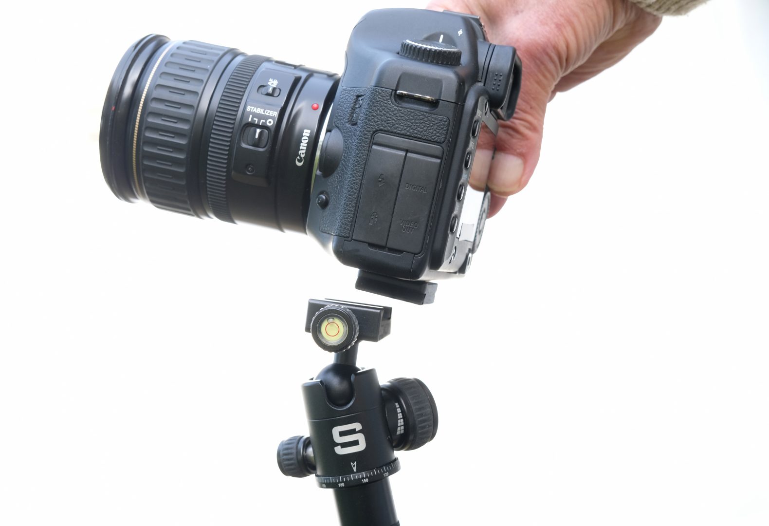 Die Gabel lässt sich gegen einen Kugelkopf mit Schnellverschluss austauschen, das bringt noch mehr Stabilität, beim Filmen sind weiche Schwenks in alle Richtungen möglich. Die Aufstecktasche aus Leder lässt sich mit einem Spezialverschluss fest auf die Basisplatte setzen. Speicherkarten und Ersatz-Akkus sind damit sicher und griffbereit untergebracht.