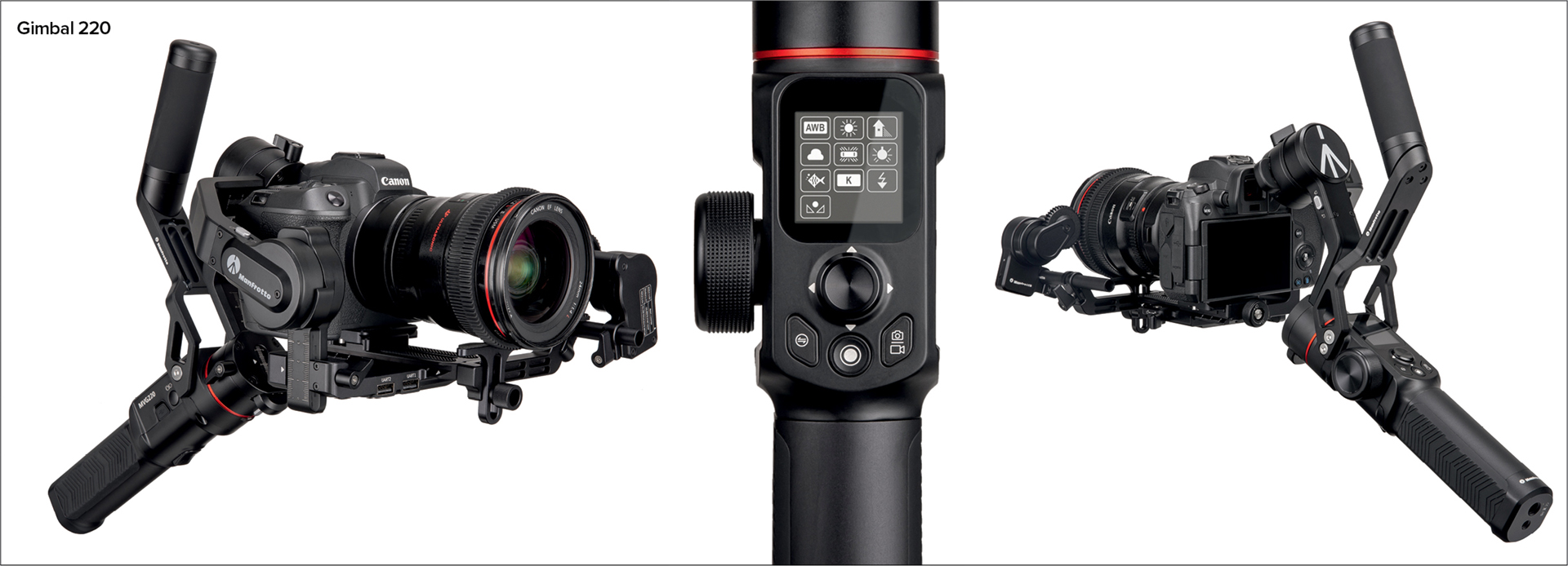 Setups ist der Gimbal 220, der auf spiegellose Kameramodelle ausgerichtet ist und über ein maximales Nutzlastgewicht von bis zu 2,2 kg sowie einen abnehmbaren Arm zur Umstellung zwischen aufrechter und gesenkter Position verfügt, um unterschiedliche Aufnahmewinkel zu ermöglichen. Der Gimbal 220 ist auch in einer Pro-Version erhältlich, die über einen Follow-Fokus verfügt, der eine präzisere Kontrolle der Bildschärfe bei Verwendung des manuellen Fokus ermöglicht. Die Betriebszeit bei diesem Modell beträgt bis zu sieben Stunden für normale Verwendung sowie 14 Stunden im Standby-Modus.