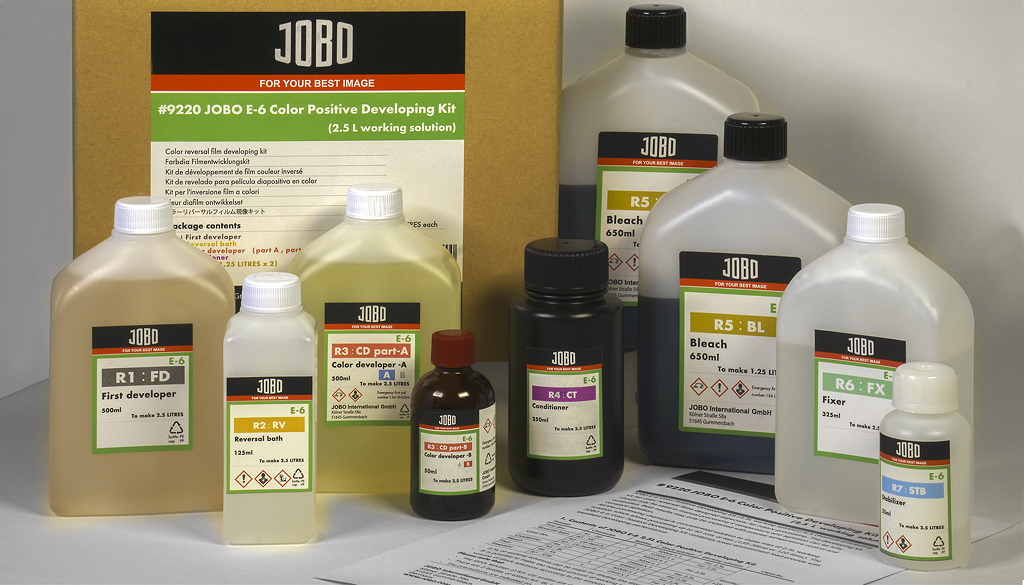 Die JOBO Chemie-Kits sind so entwickelt, dass optimale Farbwidergabe und ein ausgezeichnetes D-max erzielt werden. Dies wird unter anderem dadurch erreicht, dass alle Entwicklungsschritte so fein voneinander getrennt werden wie möglich. Das E-6 Kit für den Diafilm besteht aus den klassischen sechs Chemikalien. Für Anwender, die mit einem JOBO-Prozessor arbeiten, ist es unerheblich, ob drei oder sechs Schritte zum Ergebnis führen. Entscheidend ist, das Optimum zu erzielen.