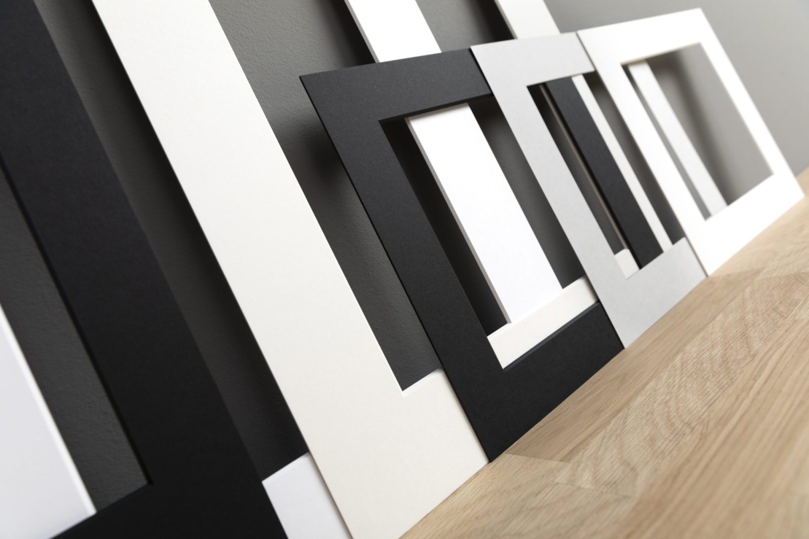 Aber auch grau bzw. schwarz durchgefärbte Passepartouts können Bilder perfekt in Szene setzen. Besonders ein Rahmen aus schwarzem Aluminium- bzw. Eichen-Profil mit einem schwarzen Passepartout betont die dunklen Farbanteile eines Schwarzweiß-Bildes auf eine elegante Art und verleiht dem Kunstwerk die gewünschte Präsenz. Ein hellgraues Passepartout wirkt angenehm leicht und neutral. Es fügt sich perfekt als Abgrenzung zwischen Bild und Bildumfeld ein. Besonders künstlerische Arbeiten in Pastelltönen setzt ein hellgraues Passepartout hervorragend ins „Rampenlicht“. Rote, grüne oder auch andersfarbige Passepartouts sind nicht mehr im Trend. Schlichte Weißtöne sind zeitlos und sehen immer edel aus.