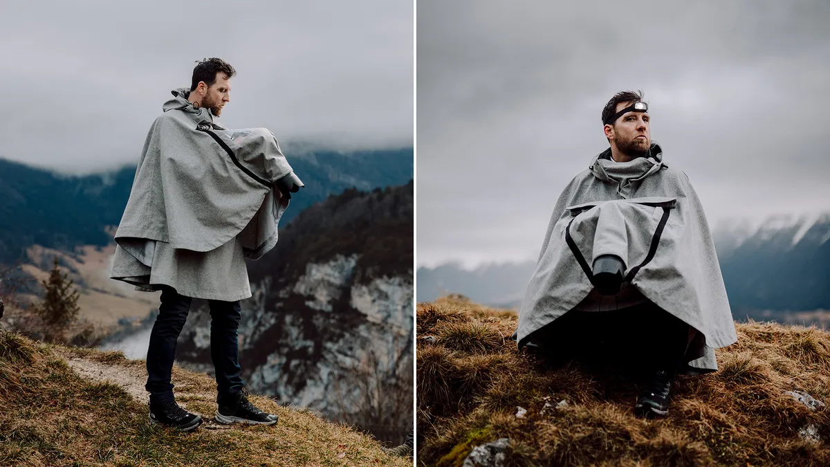 Entstanden ist die Idee vor fast zwei Jahren. Nach einem Dutzend Prototypen bietet das Cape in seiner finalen Version Funktionen, die speziell für Outdoor-Fotografen entwickelt wurden. Es besteht aus Hightech-Materialien und bietet auch unter schwierigen Bedingungen Schutz.