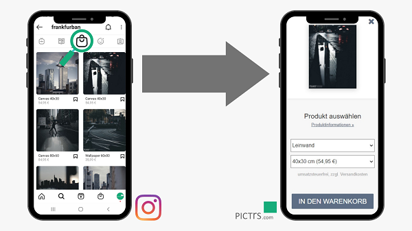 Die Produkte aus dem Pictrs-Shop lassen sich auf Facebook einpflegen und mit einem Instagram-Business-Account verknüpfen. Follower können die Fotoprodukte dann im Pictrs-Shop kaufen.