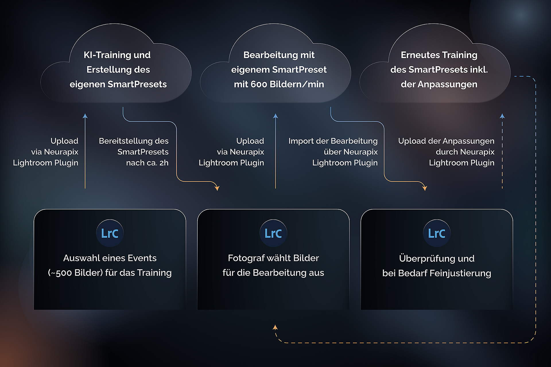 Auf diese Weise kannst du übrigens sehr schnell unbegrenzt viele neue SmartPresets erstellen, sodass du für jede Art von Shooting gewappnet bist. Je öfter du ein SmartPreset verwendest und trainierst, desto besser wird es. Sende deine manuellen Anpassungen dazu einfach regelmäßig an die Neurapix KI, um dein SmartPreset weiter zu verfeinern.