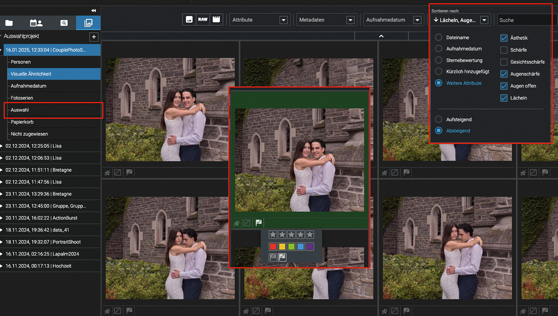 Ein echtes Profi-Tool sind die neuen „Auswahlprojekte“, die auf Ordner und Sammlungen angewendet werden können und den Prozess der Fotoauswahl weiter beschleunigen. Wird ein Auswahlprojekt erstellt, sortiert und gruppiert die Excire KI die Aufnahmen wahlweise nach Personen, Stichworten, Serienbildsequenzen, Aufnahmedatum oder auch nach visueller Ähnlichkeit. Auf Wunsch werden unscharfe, unter- oder überbelichtete Fotos oder Fotos, auf denen alle Augen geschlossen sind, direkt als „abgewiesen“ markiert. Optional ist auch die automatische Vergabe von Akzeptiert-Flaggen oder Farbmarkierungen möglich. Darüber hinaus können Fotos innerhalb der Gruppen nach Schärfe, Gesichts- oder Augenschärfe, Lächeln, offenen Augen oder ästhetischer Bewertung sortiert werden. So sind die besten Aufnahmen schnell gefunden und unbrauchbare Fotos können direkt gelöscht werden. Auswahlprojekte eignen sich nicht nur für die People- und Eventfotografie, sondern sind auch in allen anderen fotografischen Genres eine echte Arbeitserleichterung.