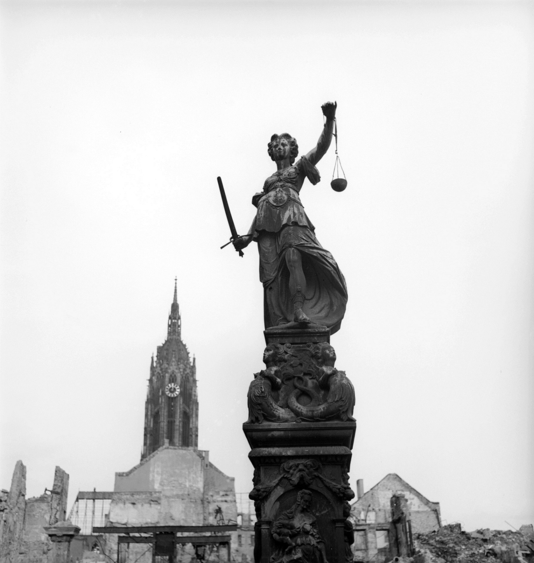 Frankfurt am Main erreichte Lee Miller Ende März 1945, wenige Tage, nachdem die amerikanischen Truppen in die zerstörte Metropole einmarschiert waren. Ihr Foto der Frankfurter Gerechtigkeitsstatue auf dem Trümmerfeld am Römer erschien kurz darauf im Juni 1945 zu Beginn des Vogue-Artikels Nazi Harvest. Auf das unfassbare Leid in den Konzentrationslagern sollte Lee Miller noch stoßen. Direkt nach ihrer Dokumentation der Befreiung des KZ Dachau entstand in München die Foto-Ikone Lee Miller in Hitlers Badewanne am 30. April, Hitlers Todestag.