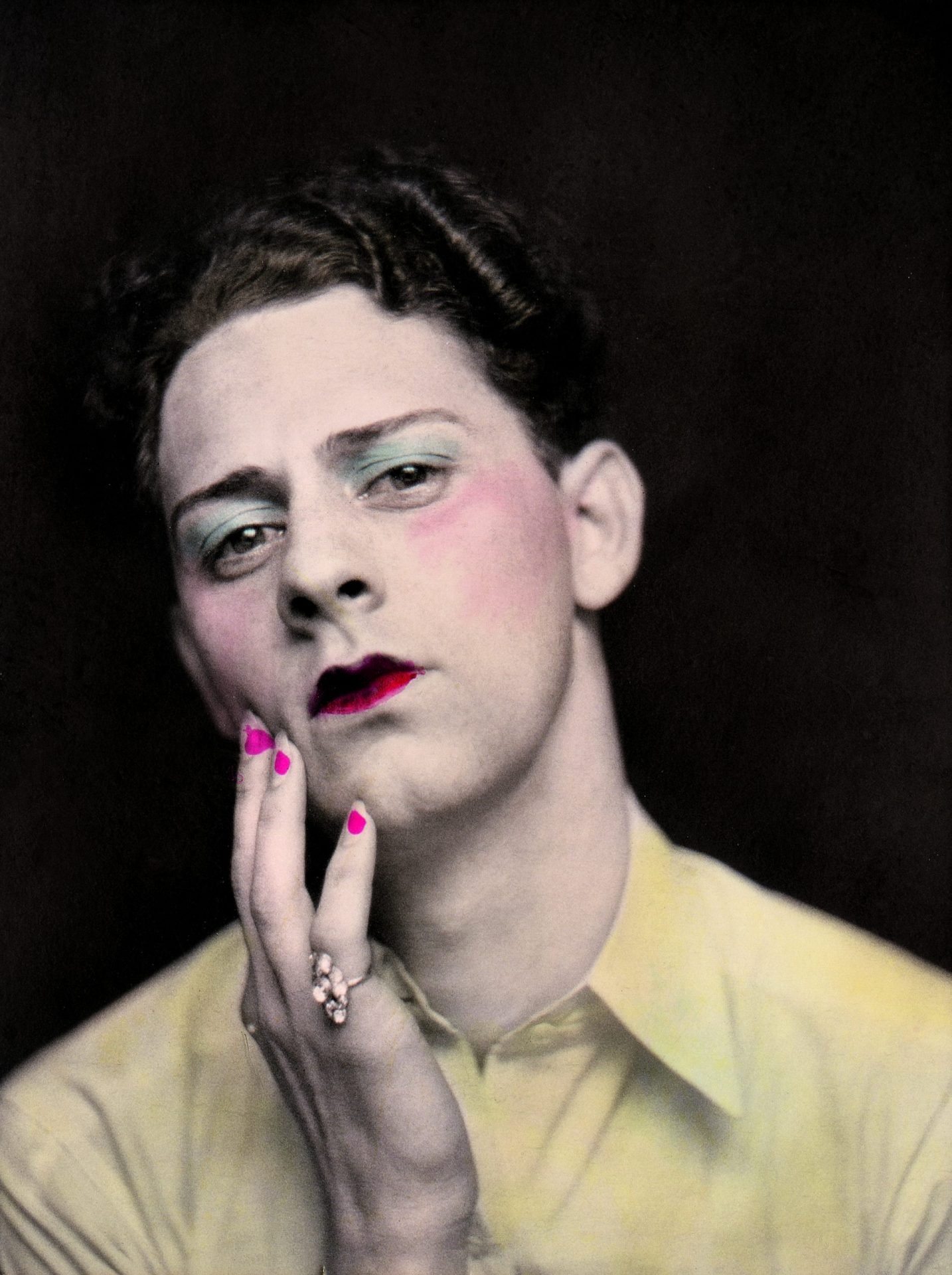 Leicht zur Seite geneigt blickt ein junger Mann mit Anmut in die Kamera, auf den markanten Wangenknochen schimmert zart das Rouge, die Lippen glänzen in einem verführerischen Rot, während über der Augenpartie zart hellblauer Lidschatten glänzt. Sanft berühren seine Finger mit rosa lackierten Nägeln die rechte Wange des Halbporträts, am kleinen Finger steckt prominent ein Ring. Oder ist es nicht doch das vermeintliche Abbild einer Frau? Können wir anhand geschlechtsspezifischer visueller Codes überhaupt entscheiden, welche Identität eine Person hat?
