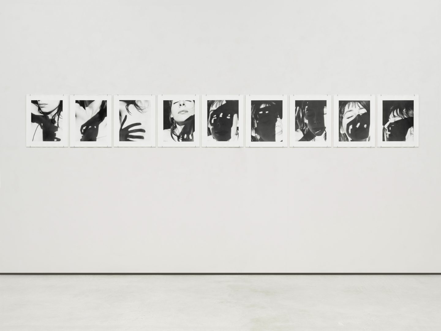 In der neunteiligen Serie von Janice Guy (*1951) werden Künstlerin und Kamera zu kollaborativen Subjekten. Die Rolle der Fotografin und des Modells verschmelzen. Guy richtet den Fokus auf sich selbst, während Hände und Kamera Schatten auf ihren Körper werfen. Die Serie ist im Laufe ihrer Zeit an der Kunstakademie Düsseldorf entstanden und zeigt in emotionaler Distanz eine herausragende Komposition von Licht und Schatten.