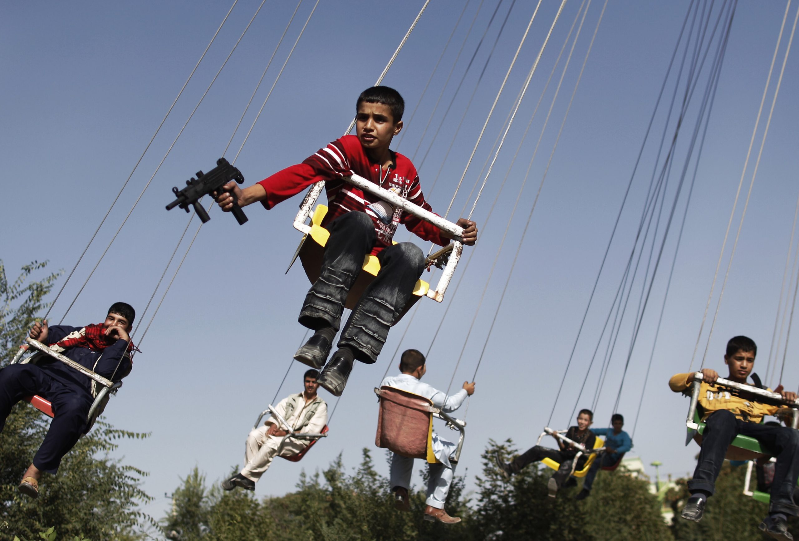 An Afghan boy holds a toy gun as he enjoys a ride with others on a…