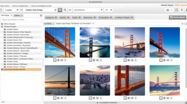 Die Medienrecherche führt so noch schneller zum treffsicheren Ergebnis. Der besondere Vorteil der Matrix-Suche ist, dass der Anwender keine Kenntnis darüber haben muss, welche Spezialfilter von welchem Anbieter angeboten werden. Als zusätzliche Option sind die individuellen Filter bei jeder Suche verfügbar und passen sich je nach Auswahl der Anbieter dynamisch an. Die klassischen Filterungen des picturemaxx Medienfilters bleiben weiterhin erhalten.
