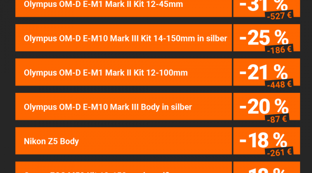Laut der Idealo Preisstudie waren vergangenes Jahr vor allem (ältere) Olympus-Kameras im Vergleich zum Oktober stark im Preis gesenkt. Pronzentual gesehen lag dabei die OM-D E-M1 Mark II (inklusive Kit-Objektiv, 12-45mm) mit rund 31 Prozent auf der absoluten Rabatt-Spitzenposition. Die OM-D E-M10 Mark III und E-M1 Mark II (ebenfalls beide mit Kit-Objekitv: 14-150mm und 12-100mm) folgten mit jeweils 25 und 21 Prozent Ersparnis, der Body der OM-D E-M10 Mark III in Silber mit knapp 20 Prozent.