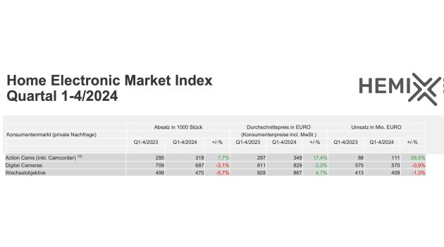 Aufgrund gestiegener Durchschnittspreise lag der Umsatz mit Digitalkameras 2024 nur 0,9% unter dem im Jahr 2023, der mit Objektiven ging im 1,3% zurück. Der Umsatz mit Camcordern, Multimedia Kameras und Action Cams legte dagegen um 26,5% auf insgesamt 111 Millionen Euro zu (2023: 88 Millionen). Davon entfallen 17,4% auf den von 297 Euro auf 349 Euro gestiegenen Durchschnittspreis in diesem Segment.