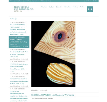 Am 25. und 26. April bietet Georgia Krawiec einen Lochkamera-Workshop an. Die Teilnehmer lernern hier selbstständig eine eigene Lochkamera zu bauen. Die Lochkamera-Fotografie bietet auf experimentelle Weise die Möglichkeit, aus dem technisierten Apparativen und dem schnelllebigen Multimedialen auszubrechen und in eine entschleunigte Welt einzutauchen. Die Teilnahmegebühr liegt bei 180 Euro. Am 14. und 15. Mai dreht sich bei Maria Sewcz alles um das Thema „Stadt“. In diesem Workshop entwickeln die Teilnehmer eine fotografische Serie über die Stadt, die aus unterschiedlichen Sujets, wie Stadtansichten, situativen Momenten, Porträts, Aufnahmen von Dingen und Details entstehen können. Die Teilnahmegebühr beträgt 180 Euro. Am 29. Mai geht Dr. Christiane Stahl von der Alfred Ehrhardt Stiftung bei einem Portfolio-Viewing der Frage nach, wie man sich als Fotograf oder Künstler bei kommerziellen und nichtkommerziellen Fotoinstitutionen bewirbt und worauf es ankommt, um ein professionelles Portfolio zusammen zustellen oder zu optimieren. Die Teilnahmegebühr beträt 90 Euro.