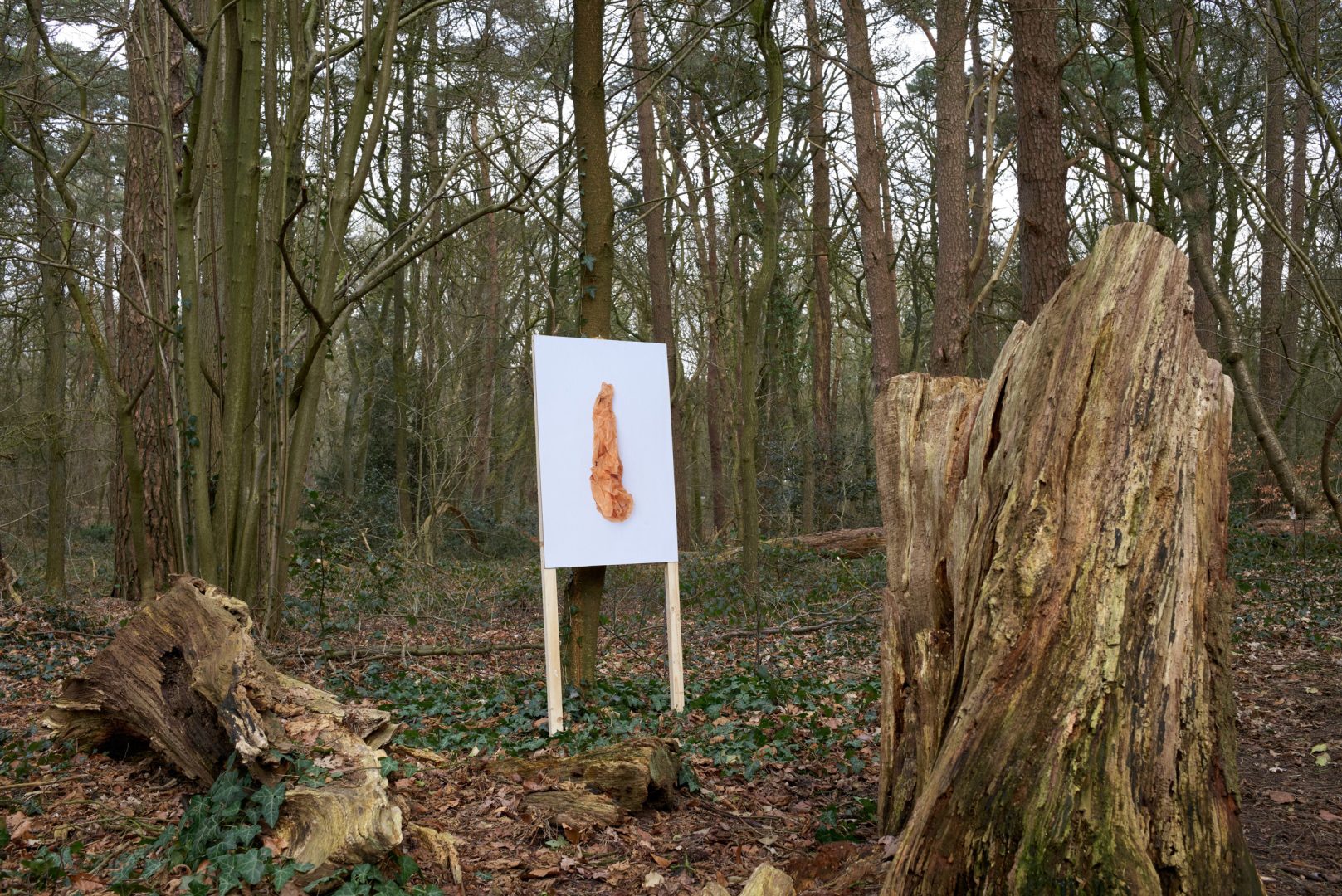 - Ausstellungsansicht #PASSAGE mit der Serie »Plastic Bags« von Wolfram Hahn auf dem Waldweg zwischen Marcusheide und Barkenhoff; In Zusammenarbeit mit den Künstlerhäusern Worpswede;