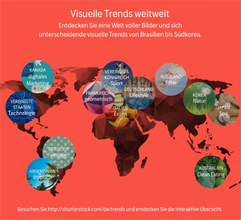 Zu den globalen Trends in puncto Fotografie, Video und Design zählen unscharfe Hintergründe, die sich als unterliegende Textebene eignen, geradliniges Design und einzigartige Blickwinkel. Neben den globalen Trends gib Shutterstock auch eine Übersicht über weltweite Trends. Während in Deutschland unter anderem die Themen „Lifestyle“, „Smart home“ und „Crossfit“ besonders gefragt sind, liegen in den USA „Technologie“ und „Smartwatch“ im Trend.