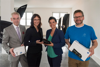 Bild (von links nach rechts): Andreas Horn, Vertrieb DACH ZEISS; Ute Nolte, Geschäftsführung PHOTO+MEDIENFORUM KIEL; Annick Langer, Marketing Manager Still Picture ZEISS; Frank Becker, EVA-Projektleiter EVA // Schule für Fotografie // Hamburg