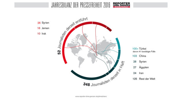 Ende 2016 sind weltweit mindestens 348 Medienschaffende wegen ihrer Tätigkeit in Haft, 20 mehr als Ende 2015. Besonders viele Journalisten, Blogger und Bürgerjournalisten sitzen in der Türkei, in China, in Syrien, dem Iran und Ägypten im Gefängnis. Weltweit sind zum Jahresende 52 Journalisten entführt, neun weniger als ein Jahr zuvor. Sämtliche Fälle sind auf nur drei Länder konzentriert: Syrien, den Jemen und den Irak. Allein die Dschihadisten des „Islamischen Staats“ halten 21 Journalisten in ihrer Gewalt, die Huthi-Rebellen im Jemen 15.