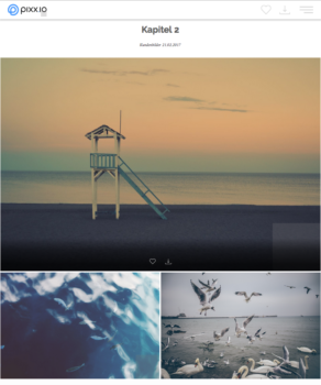 Neben dem Brand-Portal und den einfachen Möglichkeiten, Bilddaten per Mail oder sozialen Netwerken zu teilen, bietet pixx.io team mit der Photostory noch eine weitere attraktive Art und Weise der Bildpräsentation. Die Photostory nimmt die Bilder aus einer Kollektion und ordnet diese nach festen Schemata an. Dabei hat der Fotograf bewusst nur wenige Optionen, um den ganzen Prozess schlank zu halten. Denn dieses Tool dient der schnellen Präsentation und soll nicht das mit Plan und Konzept gestaltete Fotobuch ersetzen. Über die Platzierung innerhalb eines Kapitels kann der Fotograf Einfluss auf die Bildgröße nehmen. Das Aufmacherbild des jeweiligen Kapitels ist immer das größte Bild, gefolgt von zwei kleineren und dann vier kleinern Bildern. Nach diesem Schema ist jedes Kapitel aufgebaut. Der Anwender kann so viele Kapitel anlegen wie nötig und entsprechend die Bilder in diesem festen Layout positionieren sowie um kurze Textzeilen ergänzen.