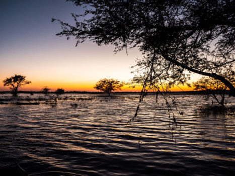 Der nächste Tag führt zu den Stromschnellen der Popafälle mit einer Fallhöhe von maximal vier Metern. Wer möchte, läuft barfuß durch den weißen Sand. Weiter geht es durch den wasserreichen Caprivi-Zipfel bis zur Kazile Island Lodge. Unterwegs spenden Monkey-Orange-Bäume ihre köstlichen Früchte. Während die Teilnehmer der Reise nachmittags im Boot auf dem Kwando dahinschippern, sehen sie mit etwas Glück neben verschiedenen Vogelarten, wie dem Bienenfresser, auch trinkende Elefanten und gähnende Flusspferde. Krönendes Ende des Tages ist die golden schimmernde untergehende Sonne.