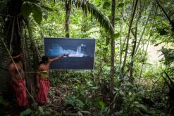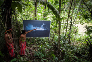 - Indios des Achuar-Stammes helfen beim Anbringen eines Bildes aus Grönland in Ecuador