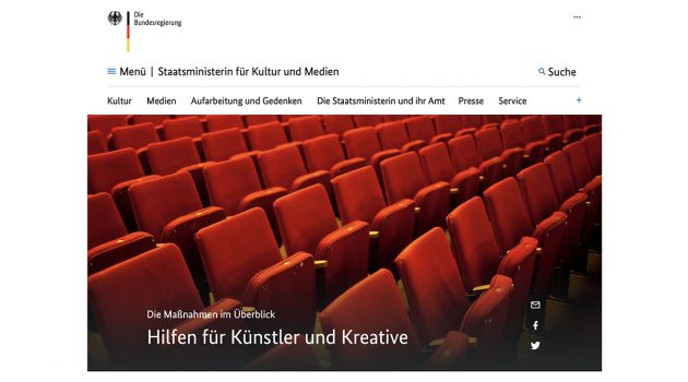 Eine Übersicht zu Unterstützungsmaßnahmen der Bundesregierung für Unternehmen und Selbständige aus dem Kultur-, Medien- und Kreativbereich unter www.kulturstaatsministerin.de