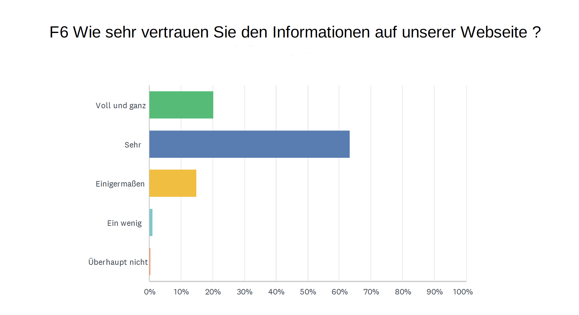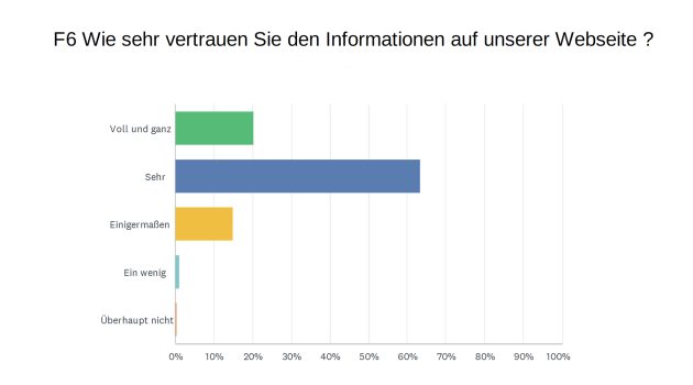 Den Informationen auf unserer Webseite vertrauen 20,3% voll und ganz und weitere 63,37% sehr. Mehr als die Hälfte der Befragten findet unseren Online-Auftritt optisch äußerst bezihungsweise sehr attraktiv (54%), und weitere 40,59% finden ihn zufriedenstellend.