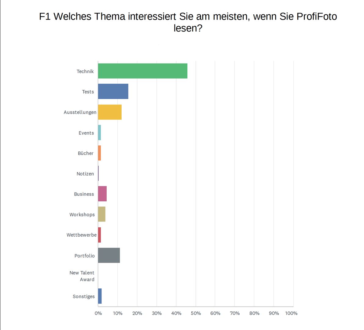 Technik (45,85%) und Tests (15,61%) stehen demnach ganz oben auf der Liste der für ProfiFoto-Online-Leser interessanten Themen, gefolgt von Ausstellungen und Portfolios. „Sehr interessant und vielfältig“, so ein Leserkommentar, „ … gehört zu den wenigen Newslettern, die ich so gut wie immer lese. Bravo!!!“
