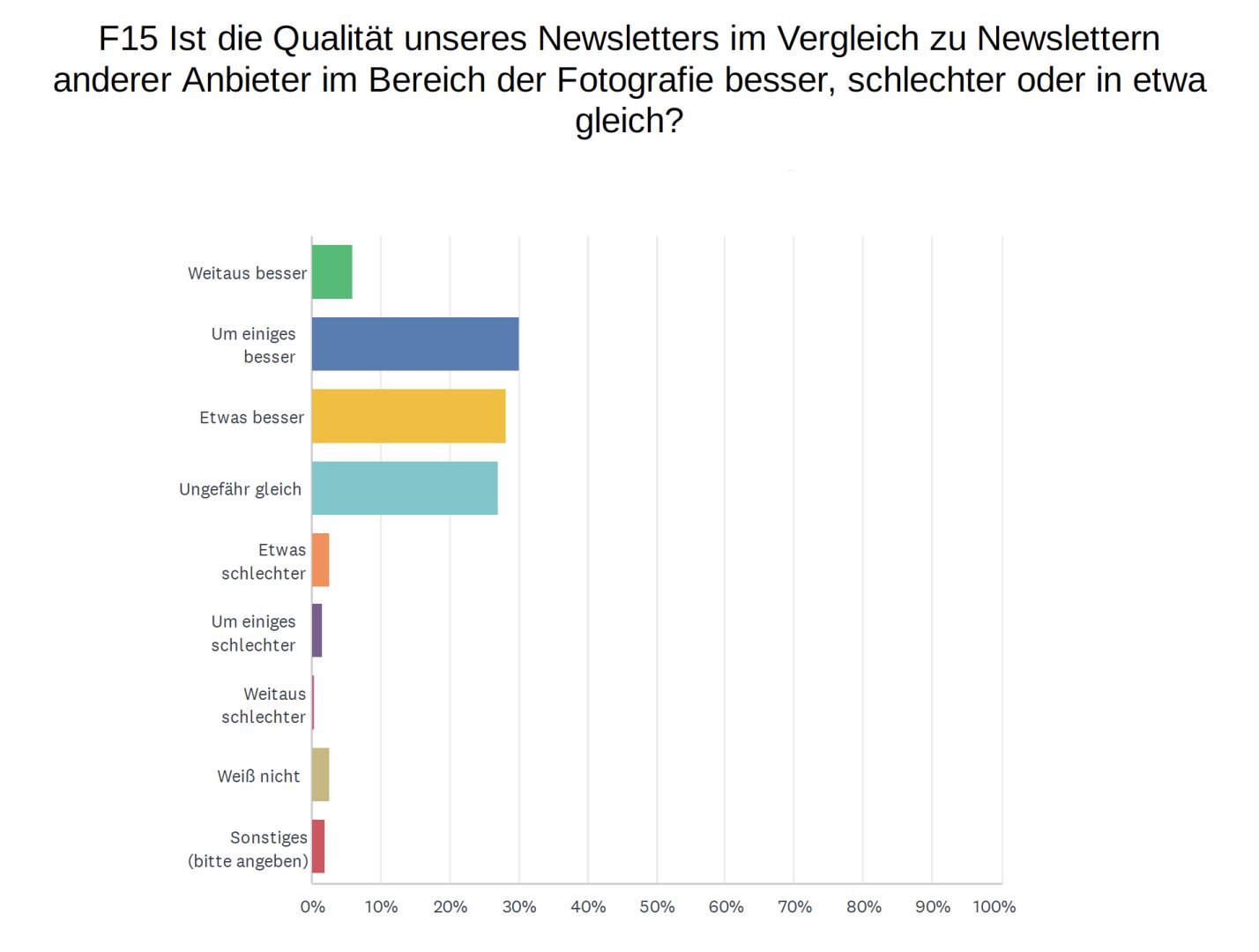 Bestnoten gab es entsprechend auch für unseren Newsletter: 44,61% schätzen diesen Service sehr, der die Ansprüche von 47,07% sehr gut und von 7,84% sogar exzellent erfüllt. Weitere 32,84% bewerten ihn mit der Note gut. Im Vergleich zu anderen Newslettern im Bereich der Fotografie finden rund 65% die Qualität des ProfiFoto-Newsletters um einiges besser.