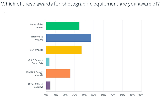 Was den Einfluss und die Bekanntheit von Auszeichnungen betrifft, so gaben ganze 47 % die TIPA World Awards als einflussreichste Auszeichnung an, was sie zur bedeutendsten Auszeichnung für Fotoprodukte macht. Rund 87 % der Befragten gab an, dass Auszeichnungen im Allgemeinen bei ihren Kaufentscheidungen eine wichtige Rolle spielen.