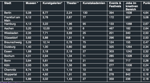 Chemnitz belegt den dreizehnten Platz, hat aber die höchste Anzahl an Museen pro 100.000 Einwohner.