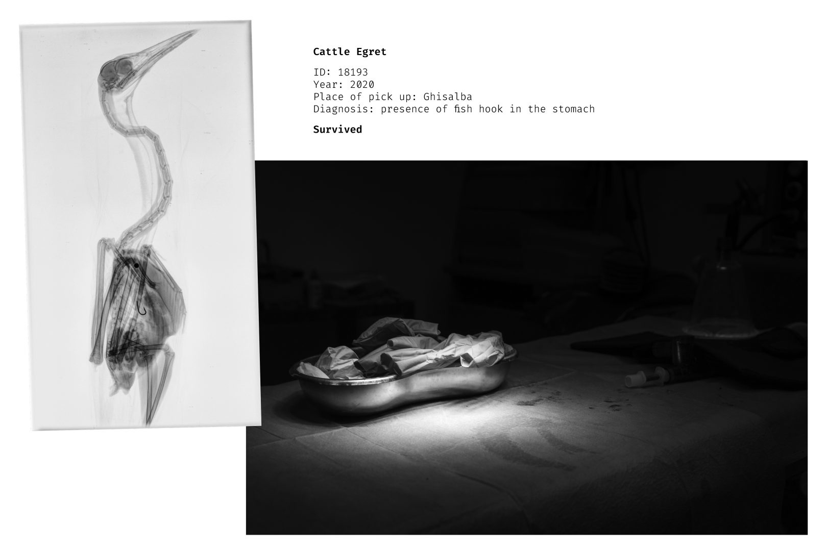 während die Schwarzweiß-Serie „Bàt-ti-to“ von Irene Facoetti (Italien, Cfp Bauer) Röntgenbilder und medizinische Daten verletzter Vögel zusammenstellt, die im Rehabilitationszentrum CRAS WWF Valpredina behandelt wurden.