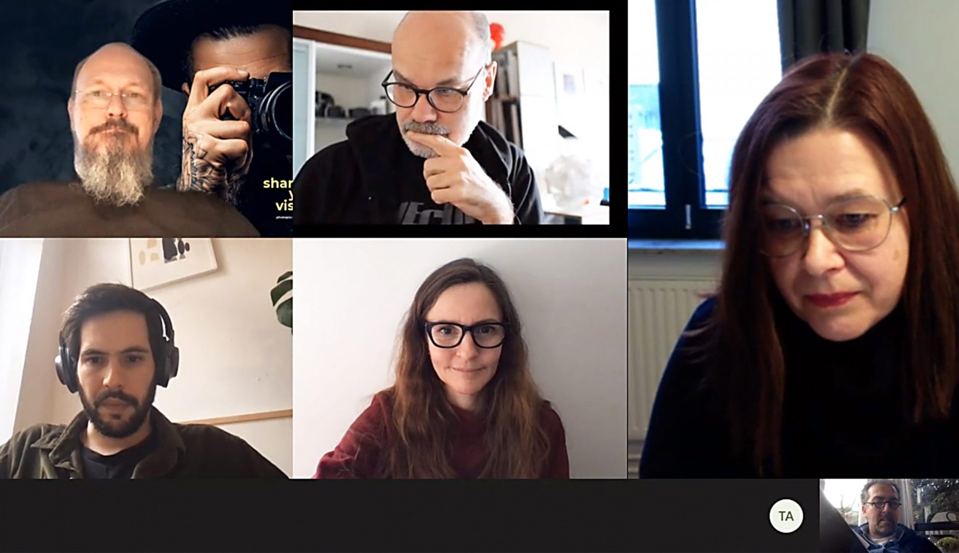 Die aktuelle Jurierung fand Corona-bedingt im Rahmen eines Online-Meetings statt, bei dem die Jurymitglieder Gelegenheit hatten, alle Arbeiten der vorausgewählten Shortlist intensiv zu diskutieren. Zur NTA Jury gehörten diesmal Silke Frigge (Bildagentur laif, rechts oben im Bild), Guido Krebs (Canon, Mitte oben), Thomas Alscheid und Fabian Fischer (Whitewall, links unten), der Fotograf und Kurator Christian Pokes (Photopia Hamburg, links oben) sowie Petra (Mitte unten) und Thomas Gerwers (ProfiFoto, ganz links unten).