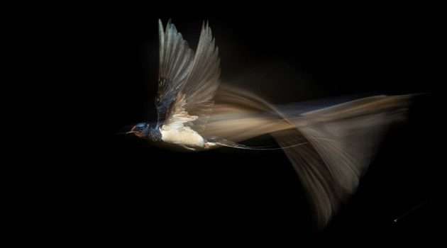 Als Stilmittel wählten die beiden Fotografen deshalb eine Langzeitbelichtung. Mit Blitzgeräten, deren Leuchtzeit besonders kurz ist, frieren sie am Ende der Belichtungszeit die Bewegung ein. So trägt die Schwalbe im Bild einen Schleier, der ihr luftig, leicht und transparent nachfliegt und gleichzeitig von ihrer hohen Geschwindigkeit zeugt.