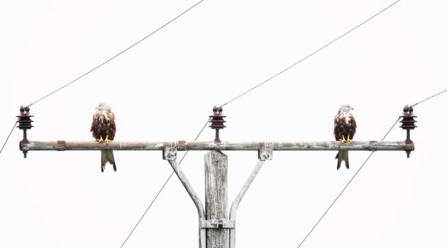 „Zu meinen Angewohnheiten gehört es, ständig in meiner Umgebung nach Vögeln Ausschau zu halten. So werfe ich jedes Mal, wenn ich an diesem Strommast vorbeikomme, einen Blick nach oben, da dort immer irgendein Vogel sitzt. Auch an diesem, etwas trüben Tag im September 2021 schaute ich kurz hoch, entdeckte den dort sitzenden Milan auf dem einen Ende und gleich darauf einen ankommenden zweiten, der sich direkt gegenüber niederließ. Dies schien spannend zu werden – waren die beiden ein Paar oder Konkurrenten? In der Hoffnung auf eventuell schöne Action-Fotos holte ich die Kamera hervor und wartete. Mein Wunsch war zunächst, sie mögen sich doch anschauen und irgendwie miteinander interagieren. Doch die beiden schienen sich einfach nichts zu sagen zu haben und schauten demonstrativ in entgegengesetzte Richtungen. Diese Szene mit ihrer perfekten Symmetrie hat mich dann doch fasziniert, und glücklicherweise hielten beide Vögel lange genug still, bis ich das gewünschte Bild im Kasten hatte“, so Silke Hüttche.