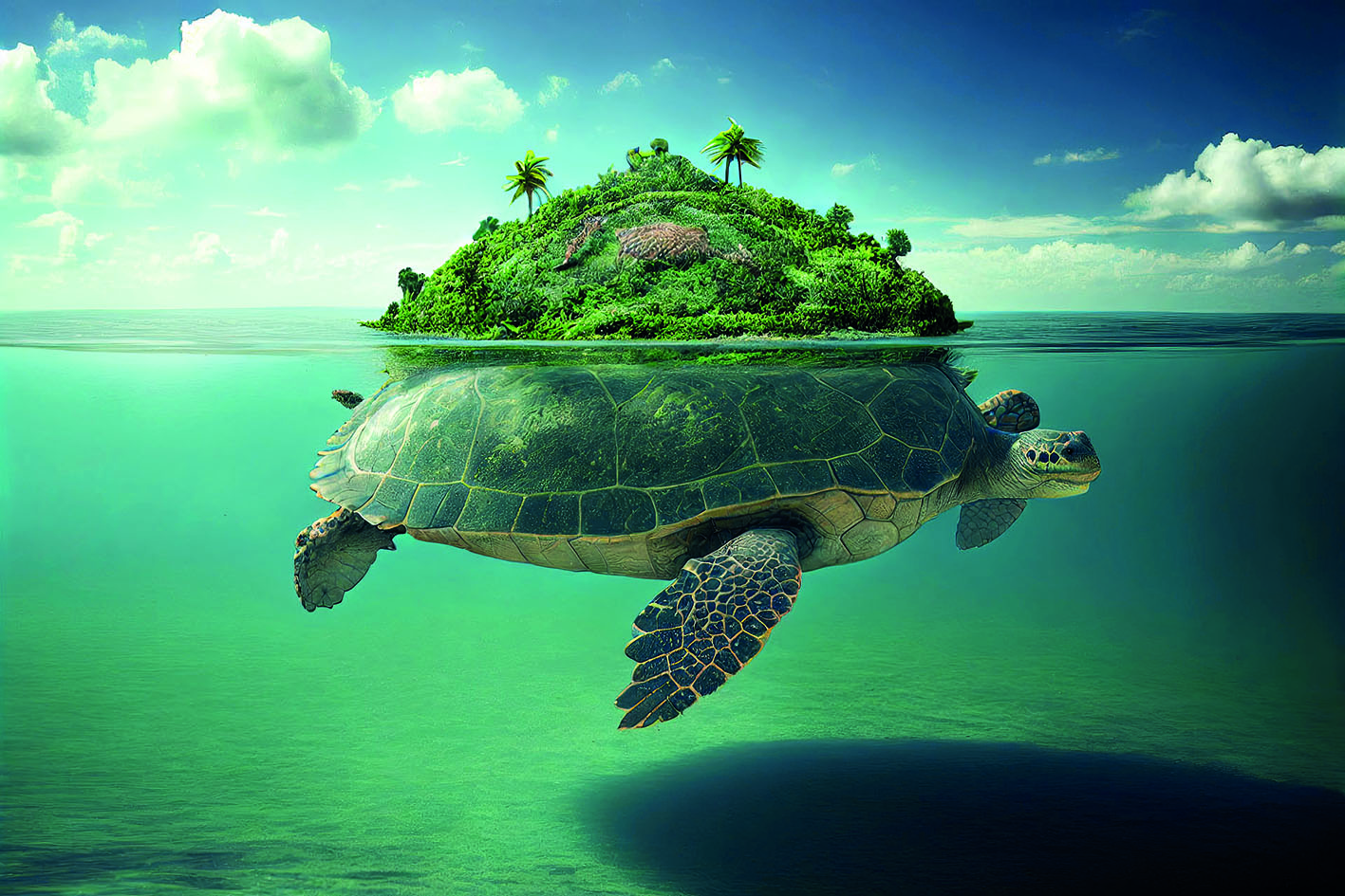 - Giant sea turtle swimming in ocean while having an island on her back (Generative AI)